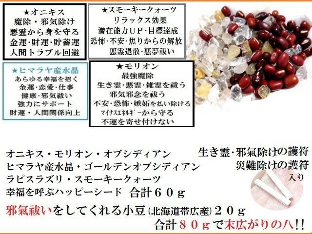 邪氣祓いをしてくれる小豆(北海道帯広産)20gの合計80gが入っており、“末広がりの八”でございます。