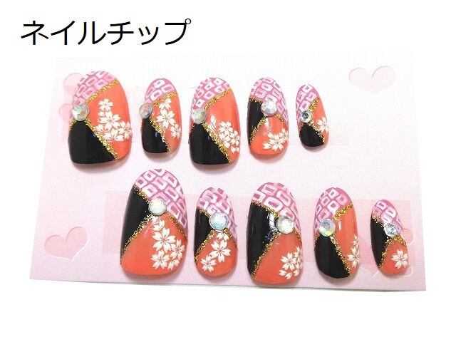 ネイルチップ★硬め仕上げ★付け爪・つけ爪★和柄★オレンジ・ピンク・ブラック★きれい系★フリーサイズ★ネイルチップ★K