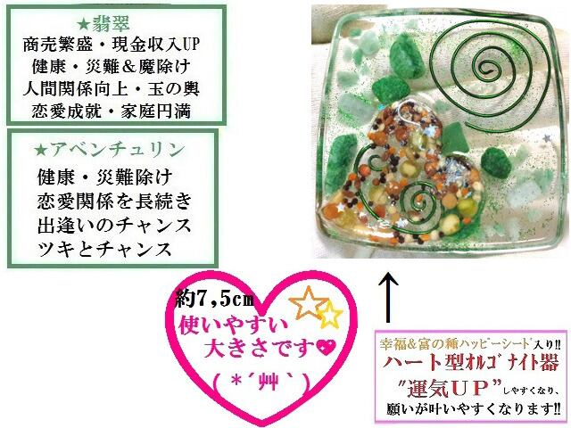 ハートのプレートには富と幸福の種”ハッピーシード”と水晶、ラッキースターが入っており、運氣上昇のお手伝いをしてくれるオルゴナイト仕上げになっております。