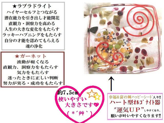 ハートのプレートには富と幸福の種”ハッピーシード”と水晶、ラッキースターが入っており、運氣上昇のお手伝いをしてくれるオルゴナイト仕上げになっております。