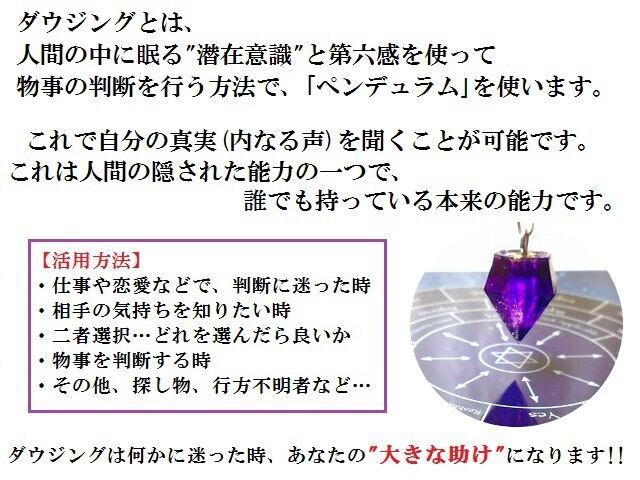 ペンデュラムは、ダウジング用に使う「振り子」の事でして、自分の潜在意識に問いかけて答えを導く、もしくはYES/NOを聞いたり、選んだり、確認したりする為のものです。