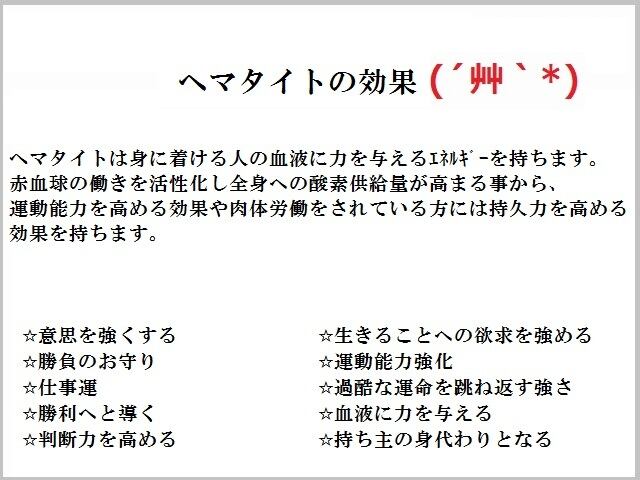 ヘマタイトは、身に着ける人の血液に力を与えるエネルギーを持ちます。