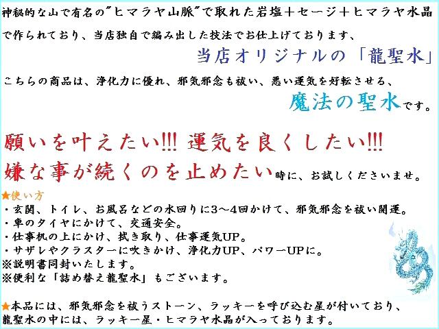 こちらの商品は、浄化力に優れ邪氣邪念も祓い、悪い運氣を好転させる魔法の龍聖水です。