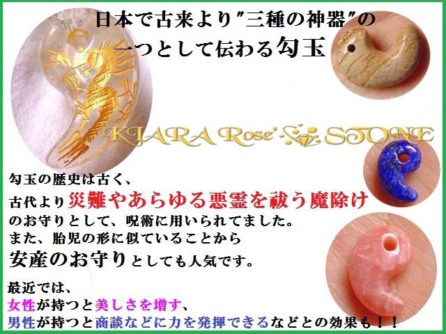 勾玉の歴史は古く、古代より災難やあらゆる悪霊を払う魔除けのお守りとして、呪術に用いられてました。 また、胎児の形に似ていることから安産のお守りとしても人気です。