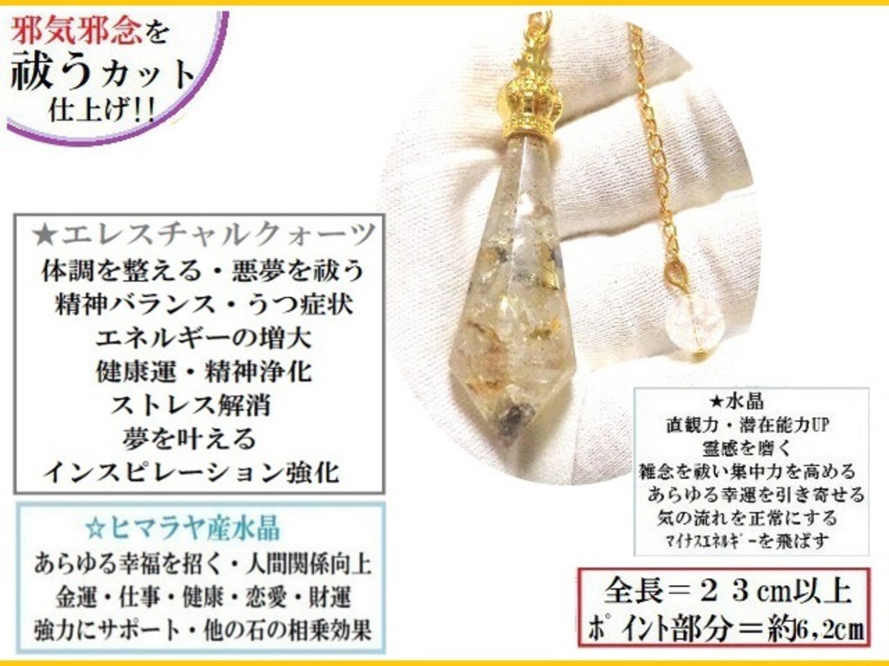 インスピレーション強化・夢叶う・エネルギー増大・健康運・うつ症状・精神浄化・ストレス解消★エレスチャルクォーツ・ヒマラヤ産水晶★ゴールド★ポイント★王冠★ペンデュラム★ダウジング★占い★スーパーパワー★パワーストーン★護符(霊符)
