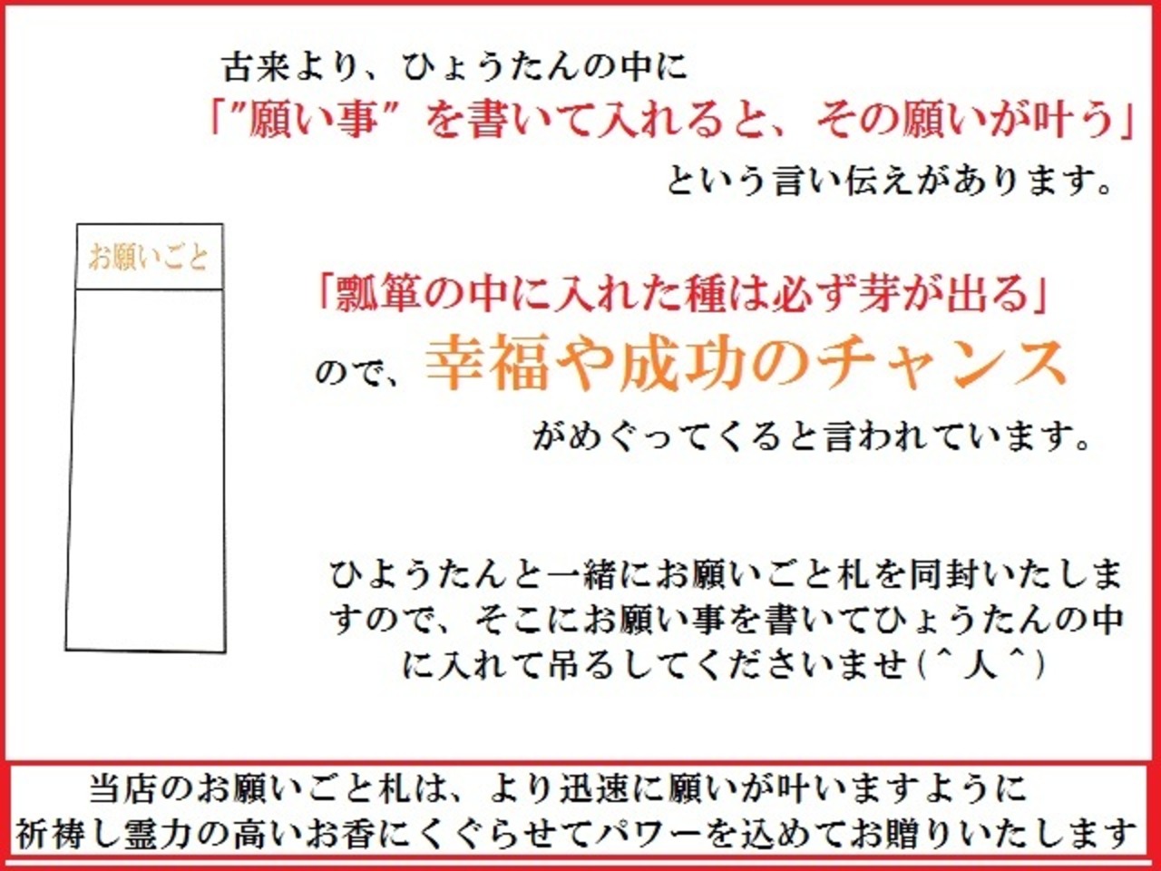 瓢箪の中に入れた種は必ず芽が出る」ので、幸福や成功のチャンスがめぐってくると言われていますので、同封いたします「お願い事札」にお願い事を書いてひょうたんの中に入れて吊るしてくださいませ。